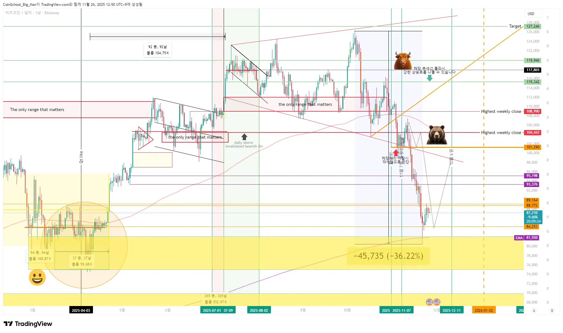 어제 말씀드린구간 86K를 지켜주면서 이쁘게 반등이 나왔습니다