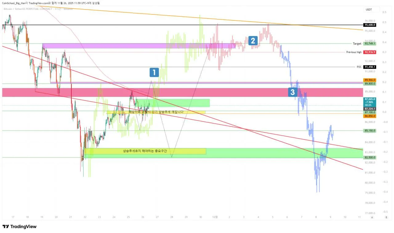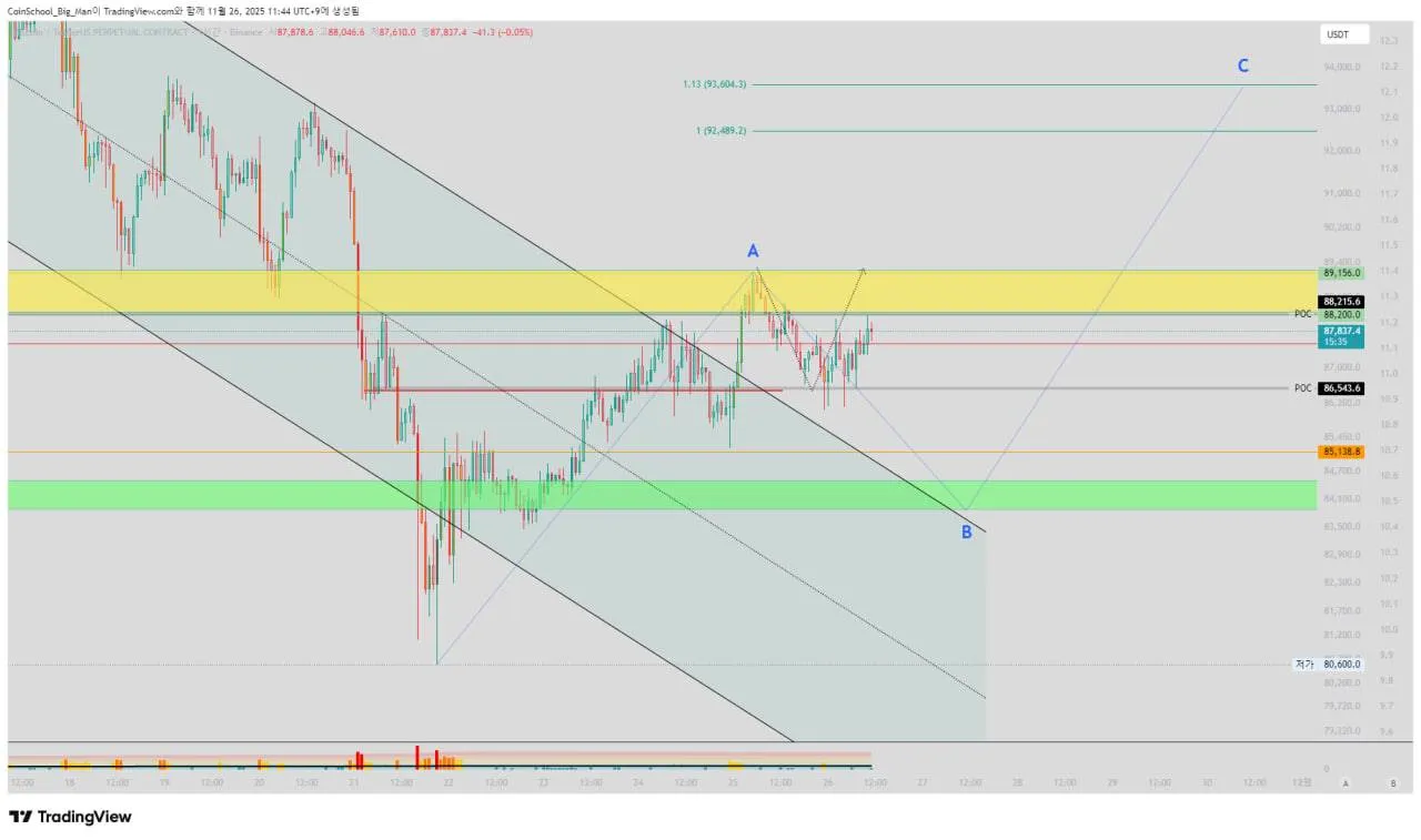 단, 코인스쿨은 추격매수는 하지않는다고 말씀드렸고 만약 89.1K가 고점이고 A파라면 B파 하락 시점에서 매수 포인트를 잡아보시는게 좋아보입니다.