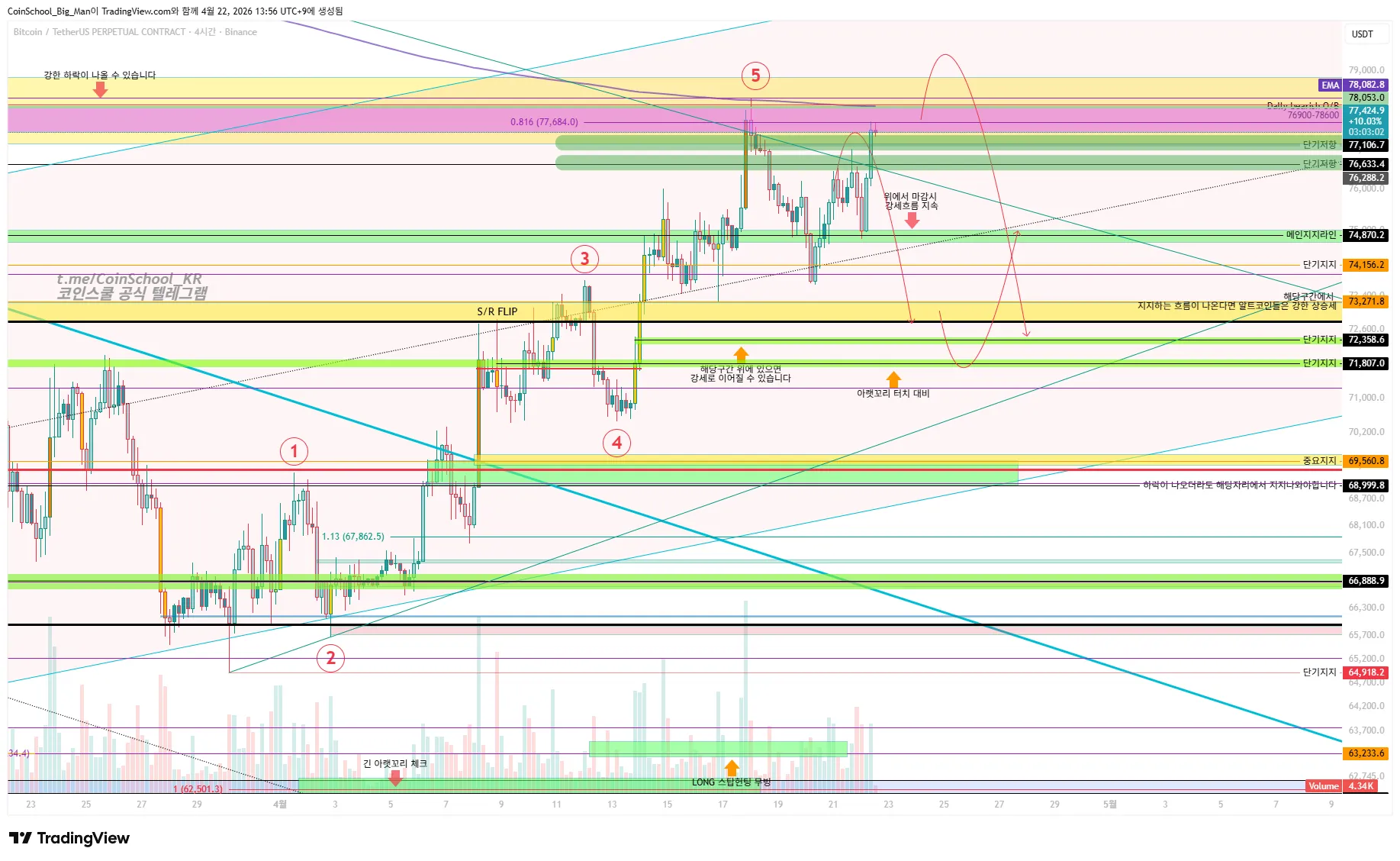 74.8K 상승 추세선이 무너지면 73K / 71K 까지는 빠르게 밀릴 각오를 해야 합니다